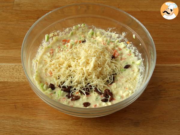 Zur Mischung hinzufügen: Zucchini + Zwiebel + Karotte + Käse. Mit Salz und Pfeffer abschmecken. Umrühren.