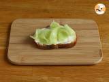 Mit einem Sparschäler Gurkenstreifen abschneiden und auf dem Käse anrichten.
