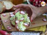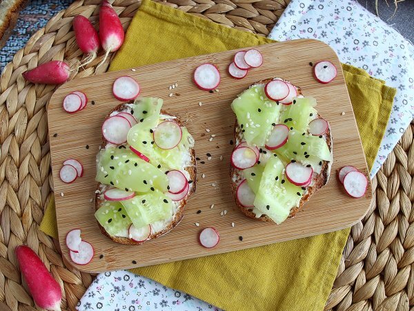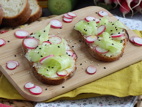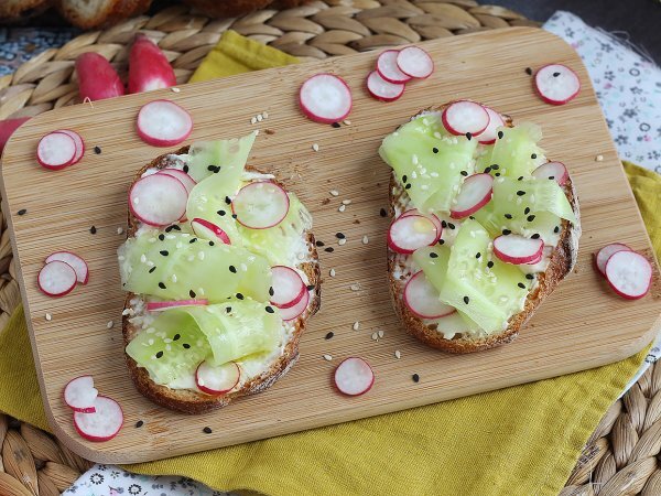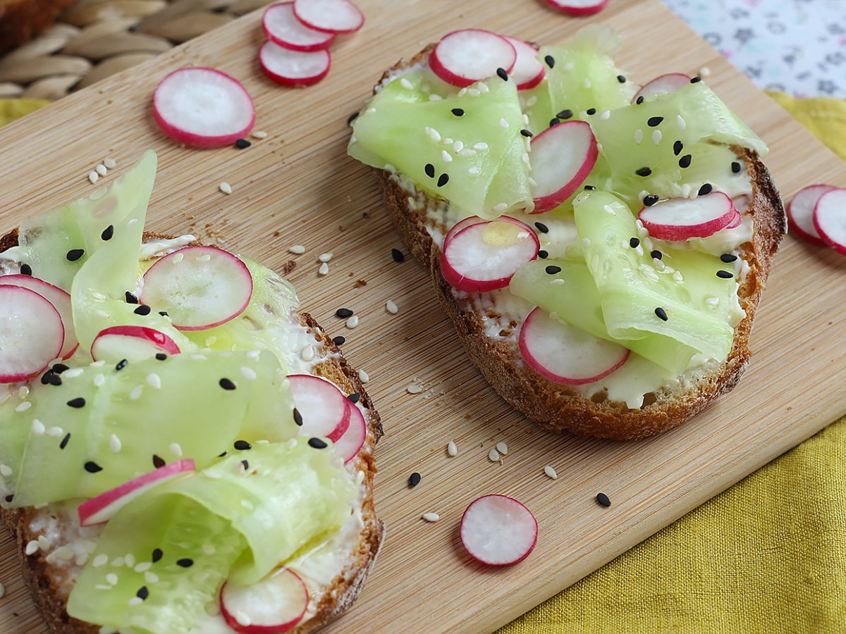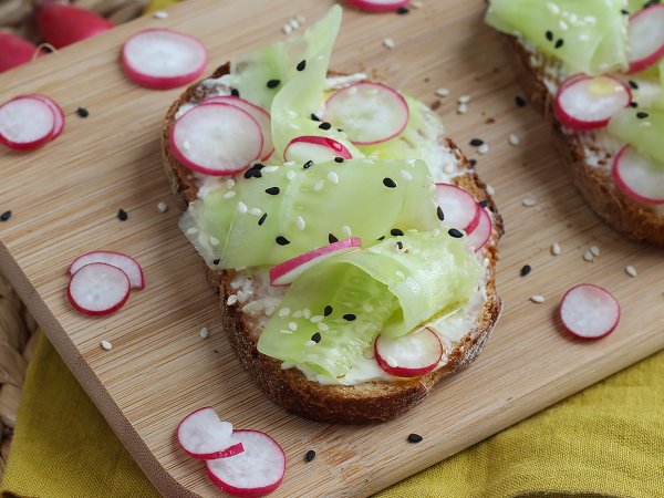Für eine einfache und effektive Mahlzeit gibt es nichts Besseres als Sandwiches! Hier bieten wir eine vegetarische Variante mit Frischkäse, Gurken-Tagliatelle und rosa Rettichscheiben an. Perfekt für ein Essenstablett vor deiner Lieblingsserie ;-)