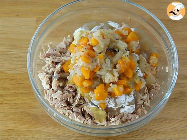 Zwiebeln und Karotten hinzufügen und verrühren. Die Pistazien zerkleinern und zur Mischung geben. Einige Stunden kalt stellen.