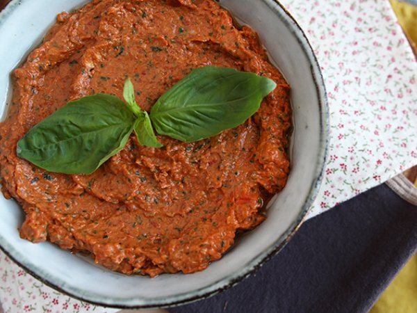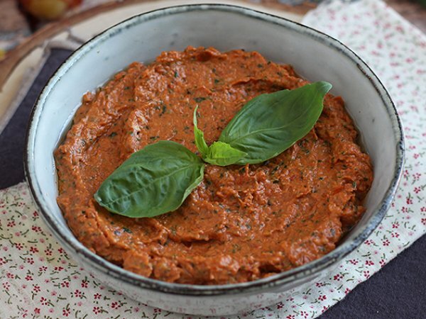 Für eine besonders glatte Masse können Sie auch einen Esslöffel des Olivenöls hinzufügen, in dem die kandierten Tomaten ruhten. - Den Aufstrich in eine Schüssel geben und bis zum Servieren kalt stellen.