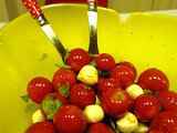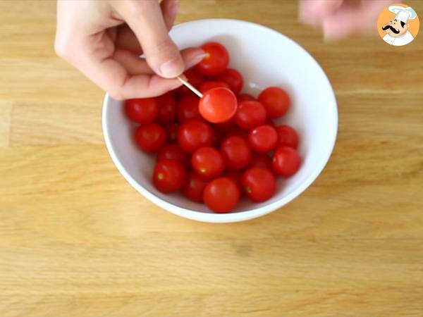 Bereite deine Kirschtomaten vor, indem du in jede Tomate am Stielansatz einen Zahnstocher steckst.
