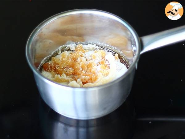 Geben Sie den Zucker in einen Topf bei mittlerer Hitze und lassen Sie ihn karamellisieren. Schütteln Sie den Topf ab und zu, um zu rühren.