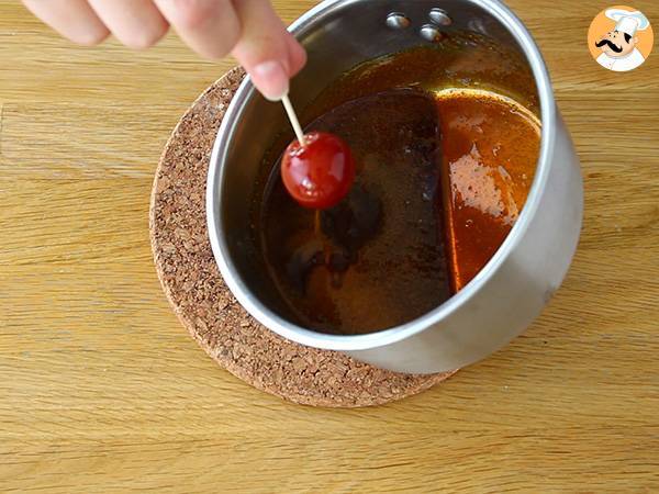Bevor das Karamell hart wird, kippen Sie den Topf und tauchen Sie jede Tomate ein, sodass sie mit Karamell überzogen ist.