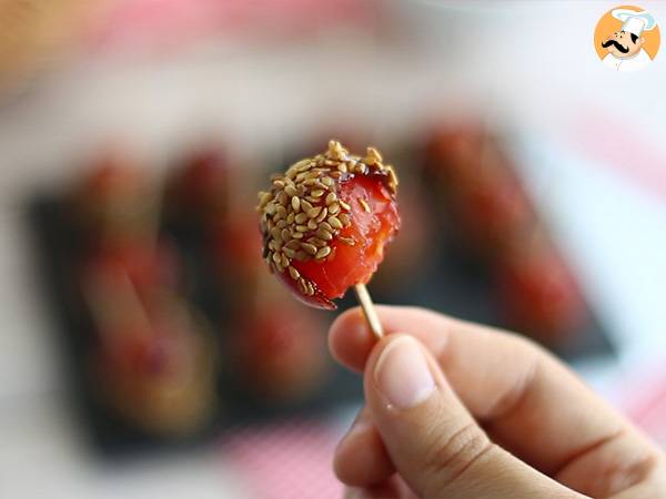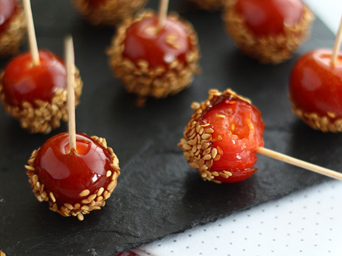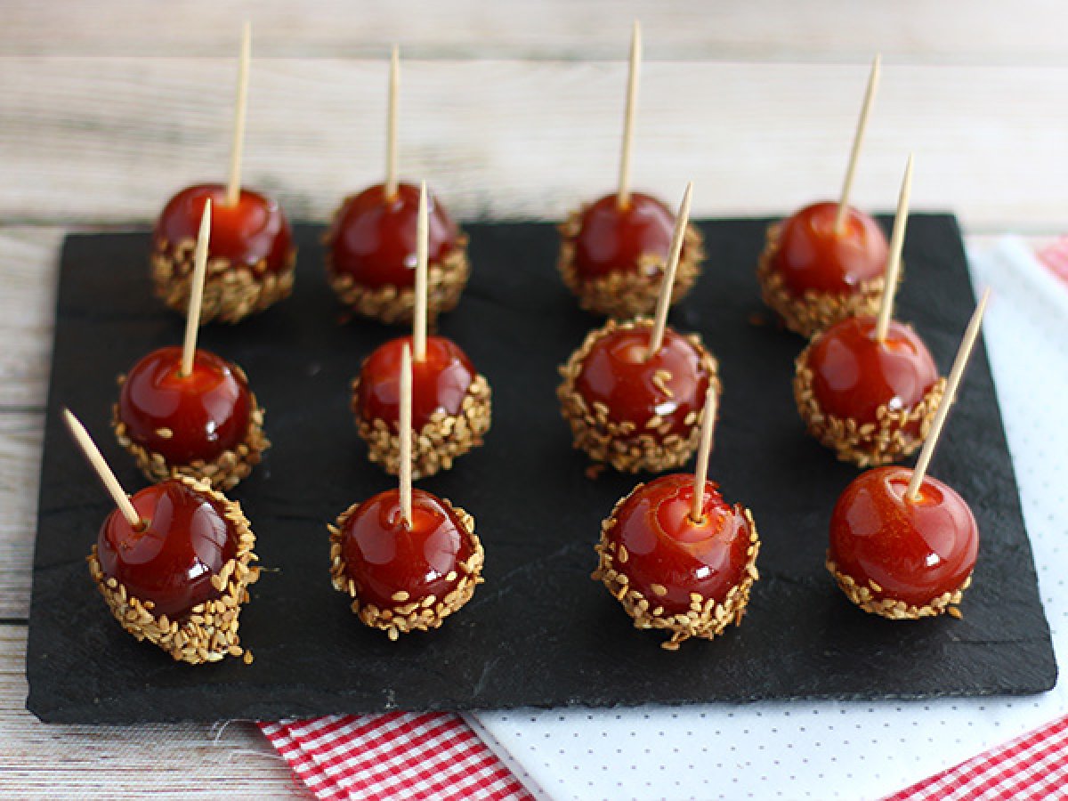 Karamellisierte kirschtomaten mit sesamsamen oder liebestomaten