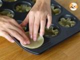 Schneiden Sie mit dem Ausstecher Kreise aus den drei übereinandergelegten Brickblättern aus. Drücken Sie jeden dieser Kreise in eine Vertiefung der Muffinform (die Form muss nicht mit Butter eingefettet werden).