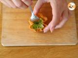 Legen Sie Jakobsmuscheln in jede Muschel und geben Sie einige Pinienkerne in jedes Knusperstück. Geben Sie schließlich einige Tropfen Zitronensaft in jedes Knusperstück.