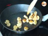 Braten Sie Ihre Jakobsmuscheln in Olivenöl an, bis sie schön geröstet sind.