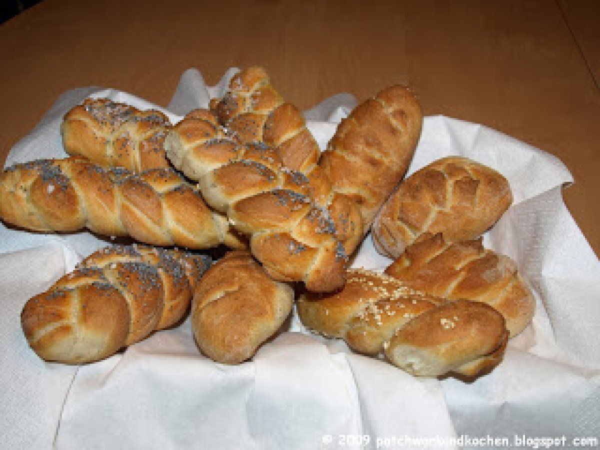Weckerl liegen auf dem Teller. Die Weckerl ohne Rotation mit einer Schere immer wieder geschnitten. 15 Minuten. Decken und zu warm. - Alle bestreichen und mit kaltem Wasser bestreichen und mit Sesam, Mohn oder Flachs.