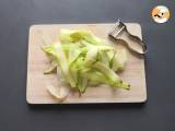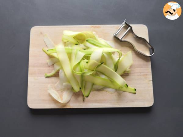 Die Zucchini waschen und mit einer Mandoline oder einem Gemüseschäler sehr dünn schneiden.