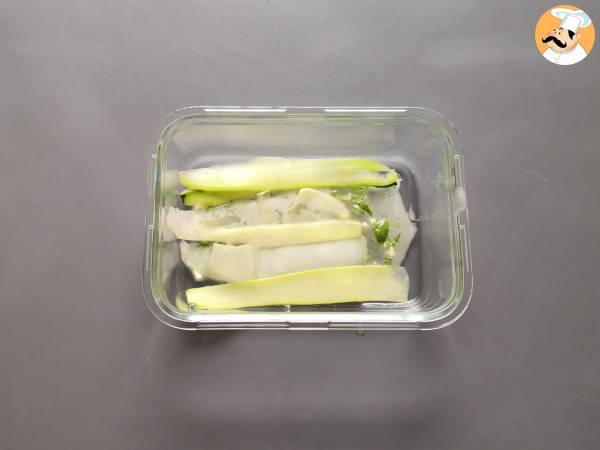 Decken Sie die Form mit Frischhaltefolie ab (Sie können auch direkt einen luftdichten Glasbehälter verwenden) und lassen Sie die Zucchini mindestens 3 Stunden im Kühlschrank ruhen.