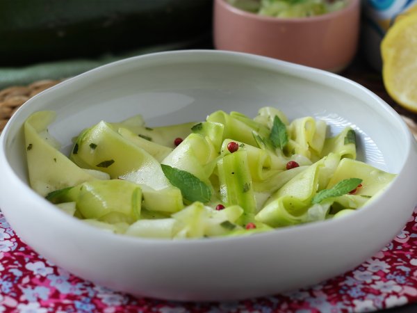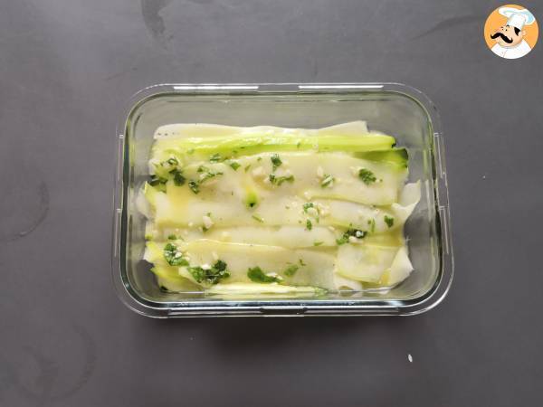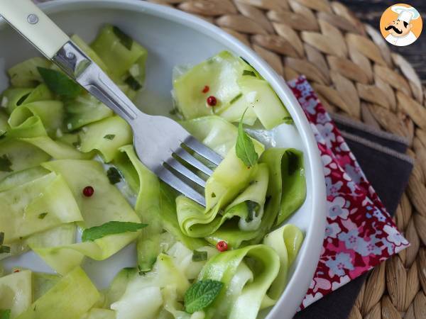 Entdecken Sie ein super erfrischendes Sommerrezept: roh marinierte Zucchini! Sie eignen sich hervorragend als Vorspeise, als Beilage oder auch zum Garnieren Ihres Toasts oder Ihrer Sandwiches. Um dieses frische (foods-desalterants-aid-2167">für heiße Sommertage) und köstliche Gericht zuzubereiten, Wir verwenden einen Gemüseschäler (oder eine verstellbare Mandoline, falls Sie eine haben). Sobald wir sie in Scheiben geschnitten haben, legen wir sie einfach in eine hübsche Schüssel und würzen sie mit einer speziellen Marinade :-) Das Ergebnis? Ein superfrisches vegetarisches Gericht, duftend und leicht würzig, bei dem alle zustimmen werden! Dieses Gemüse-Carpaccio wird zweifellos zu einem Ihrer Lieblings Sommer-Rezepte!