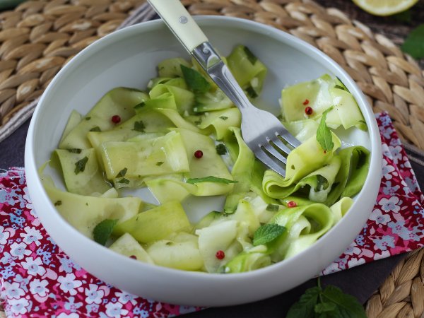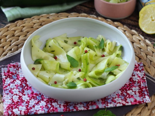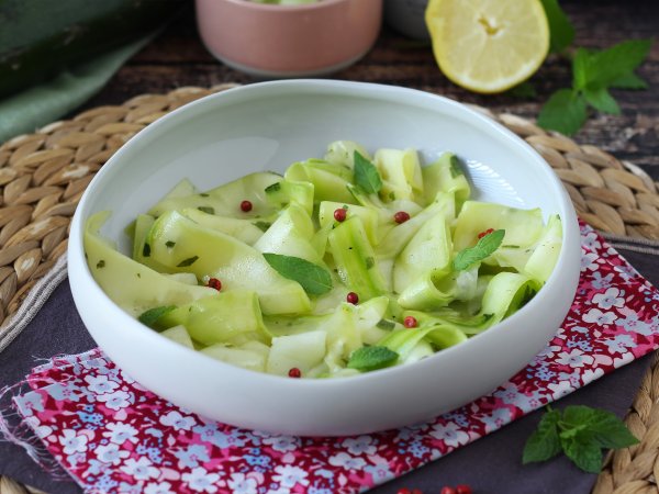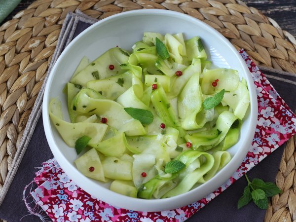 Nach dem Marinieren die Zucchini in eine Schüssel oder einen großen Teller geben. Mit Salz und Pfeffer (falls nötig) würzen und die Zucchini servieren, mit rosa Pfefferkörnern und Minzblättern garnieren. Fertig ist Ihr Zucchini-Carpaccio!