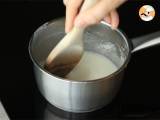 Tangzhong zubereiten: In einen Topf das Wasser gießen. Das Mehl dazugeben und mit einem Schneebesen verrühren. Anschließend bei geringer Hitze rühren, bis die Mischung eindickt und 65 °C erreicht. Filtern und 6 Stunden kühl stellen.