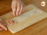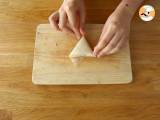 Falten Sie das Dreieck über das Blatt und färben Sie den restlichen Teil des geschlagenen Eies. Falten Sie das Ende des Blattes und drücken Sie fest, um die Samoussa zu schließen.