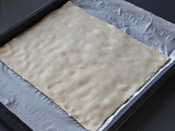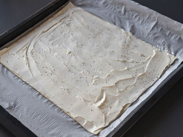 Den rechteckigen Blätterteig auf ein Backblech legen und mit Frischkäse bestreichen.