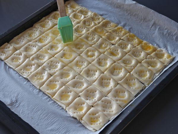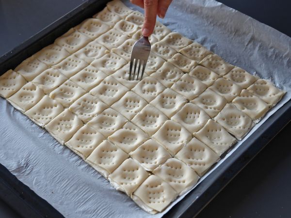 In die Quadrate runde Löcher drücken und dann mit einer Gabel einstechen.