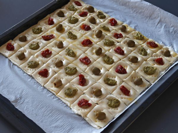 Die Füllungen in die Mitte der Blätterteigtaschen legen: hier Oliven, getrocknete Tomaten, Pesto.