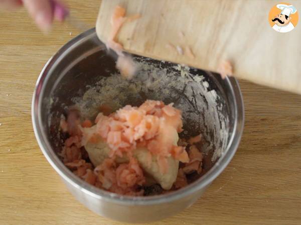 Die Crème fraîche hinzufügen und mit den Händen zu einem geschmeidigen Teig verarbeiten. Zögern Sie nicht, noch etwas Mehl hinzuzufügen, wenn der Teig zu klebrig ist.
