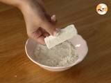 Bemehlen Sie jede Käsestange gut und geben Sie sie dann in die geschlagenen Eier.