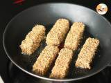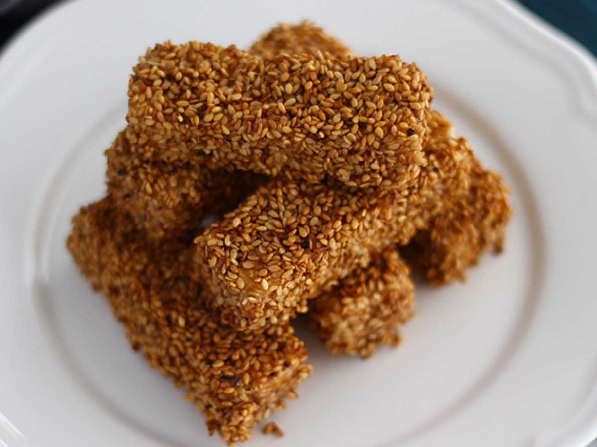 Zum Schluss die Stangen im Sesam wälzen, sodass sie gut bedeckt sind. 20 Minuten kalt stellen.