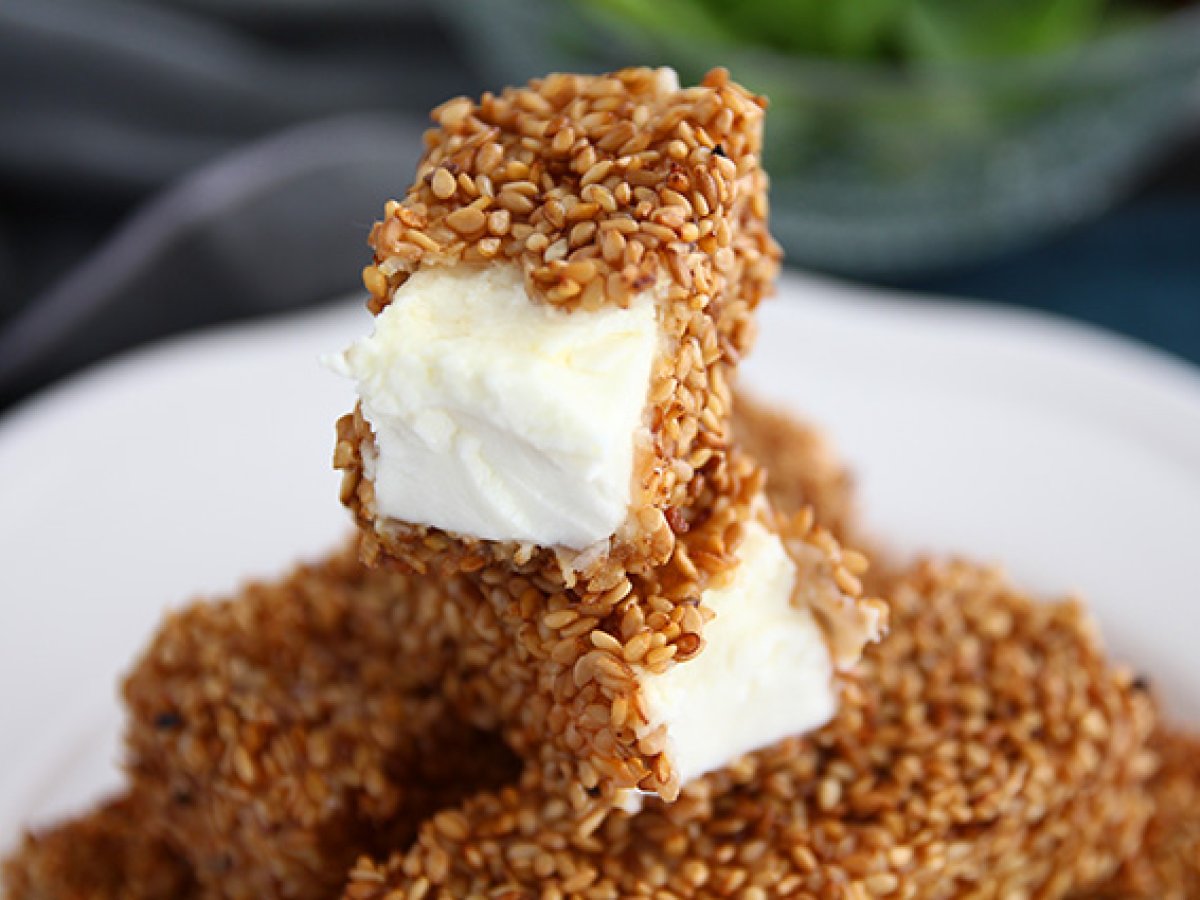 Sie können verschiedene Käsesorten verwenden, wie z.B. Ziegenkäse oder Halloumi, und die Sesamkörner durch andere Samen oder Gewürze ersetzen, um neue Geschmacksrichtungen zu kreieren.