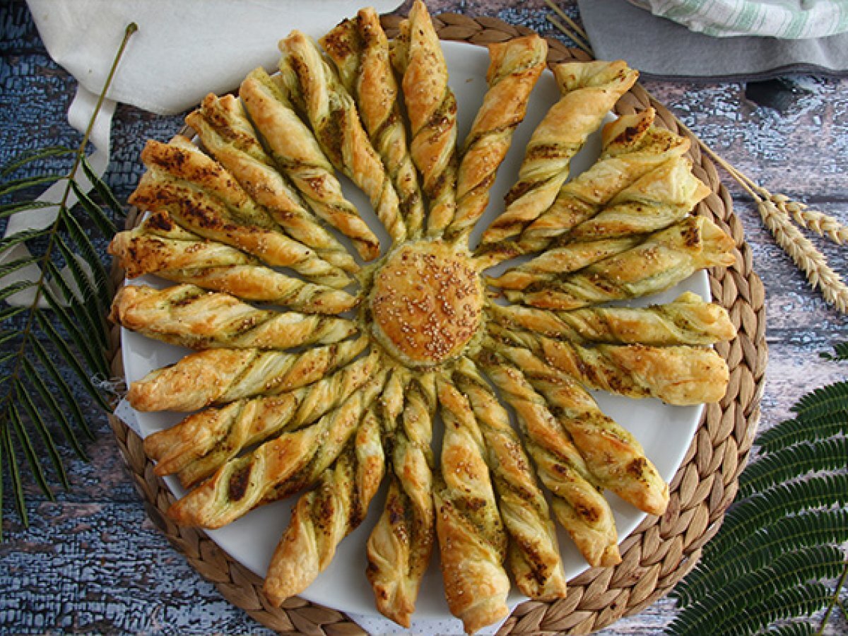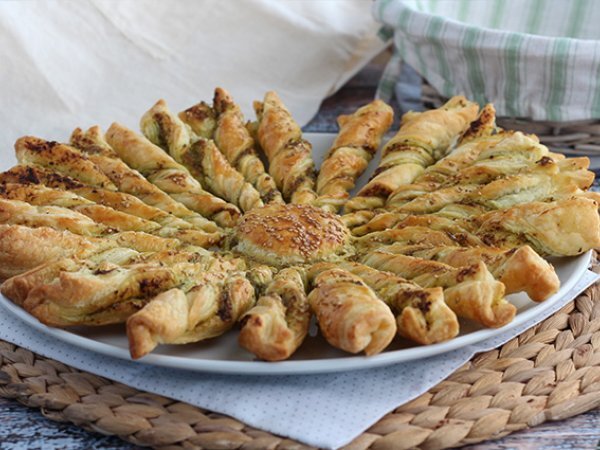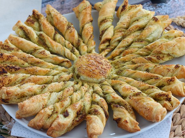 Für dieses Rezept benötigen Sie nur 4 Zutaten: Blätterteig, Pesto-Sauce, ein Ei und Sesamsamen.