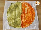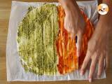 Eine Hälfte des Blätterteigs mit Pesto bestreichen, die andere Hälfte mit Pesto Rosso.