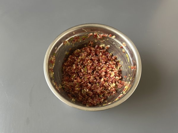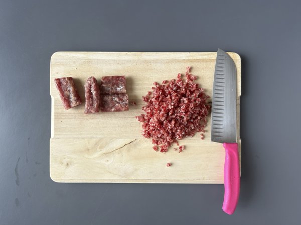 Entfernen Sie die Haut vom Fuet und schneiden Sie es mit einem scharfen Messer in kleine, gleichmäßig große Würfel. Wenn Sie möchten, können Sie auch einen Fleischwolf verwenden. Beiseite stellen.