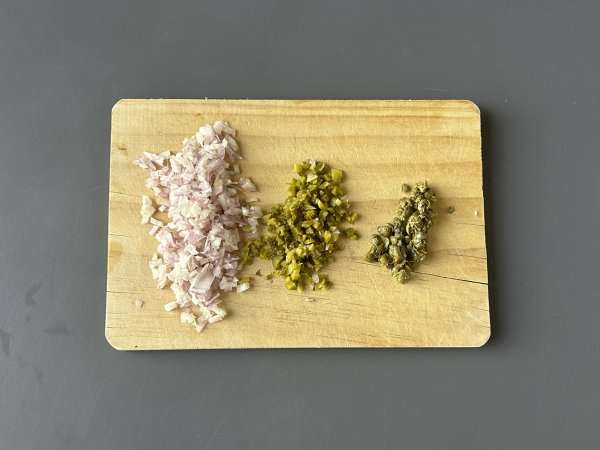 Die Schalotte schälen und fein hacken. Dasselbe mit den Gewürzgurken und den Kapern tun. Beiseite stellen.