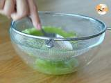 Gib das Gurkenpüree in ein Sieb und drücke es fest, damit so viel Wasser wie möglich herauskommt.