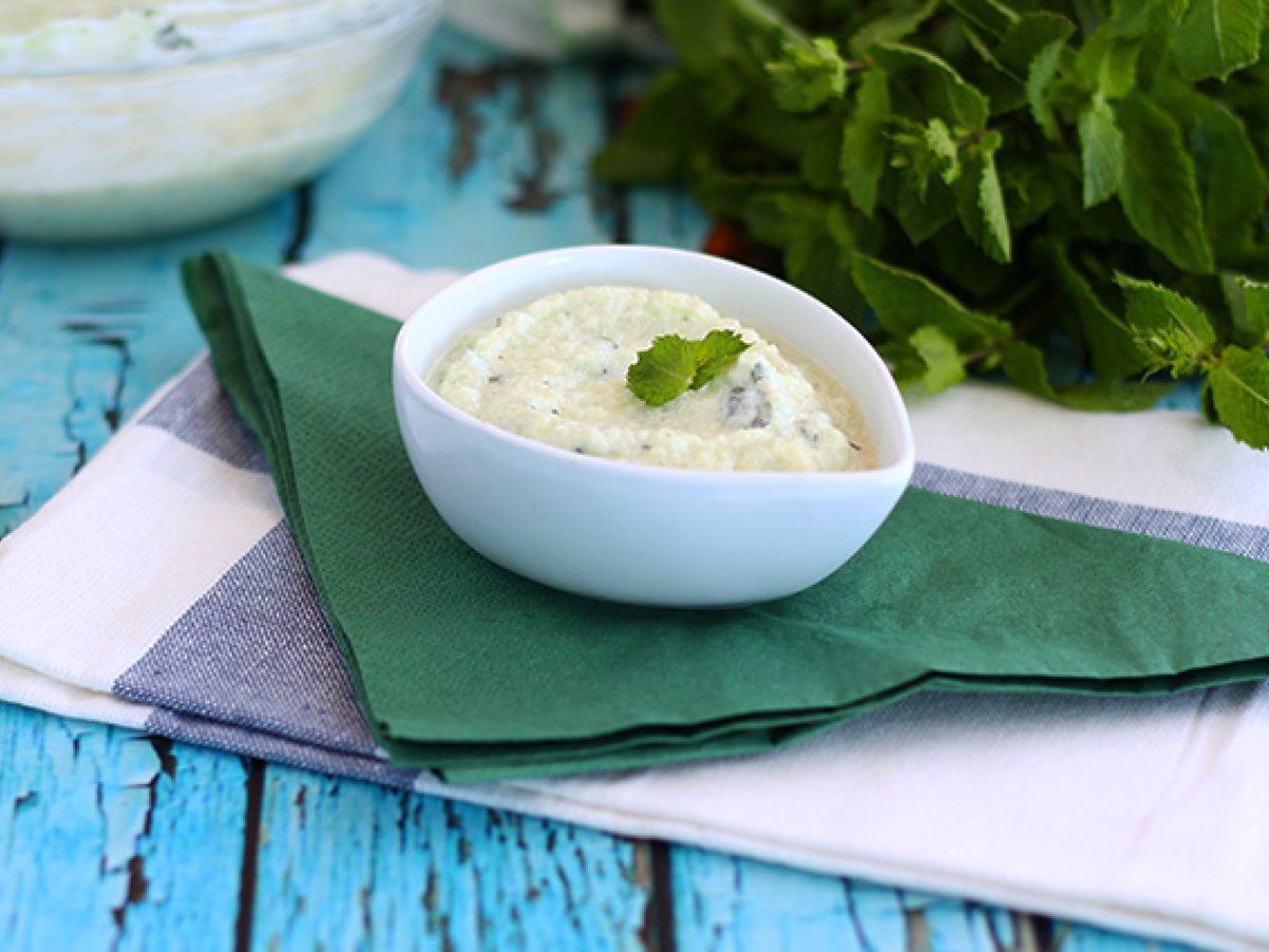 Fügen Sie dem geriebenen Gurkenfleisch griechischen Joghurt, gehackte Minze, zerdrückte Knoblauchzehe und Olivenöl, Salz, Pfeffer hinzu und gut vermischen.
