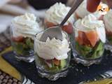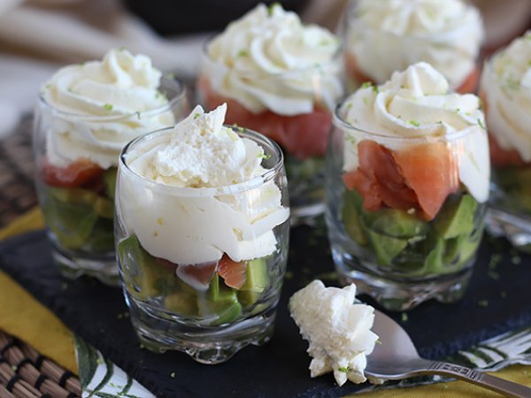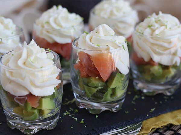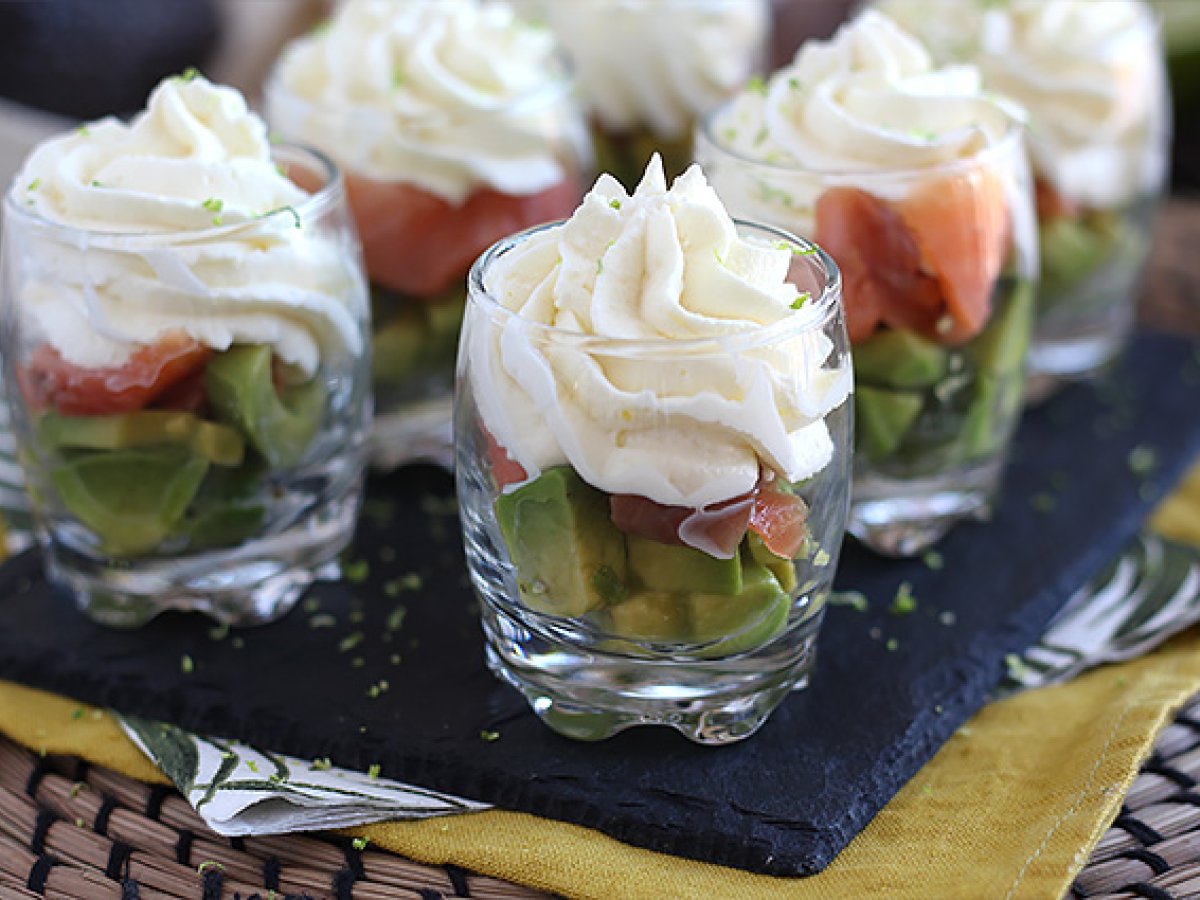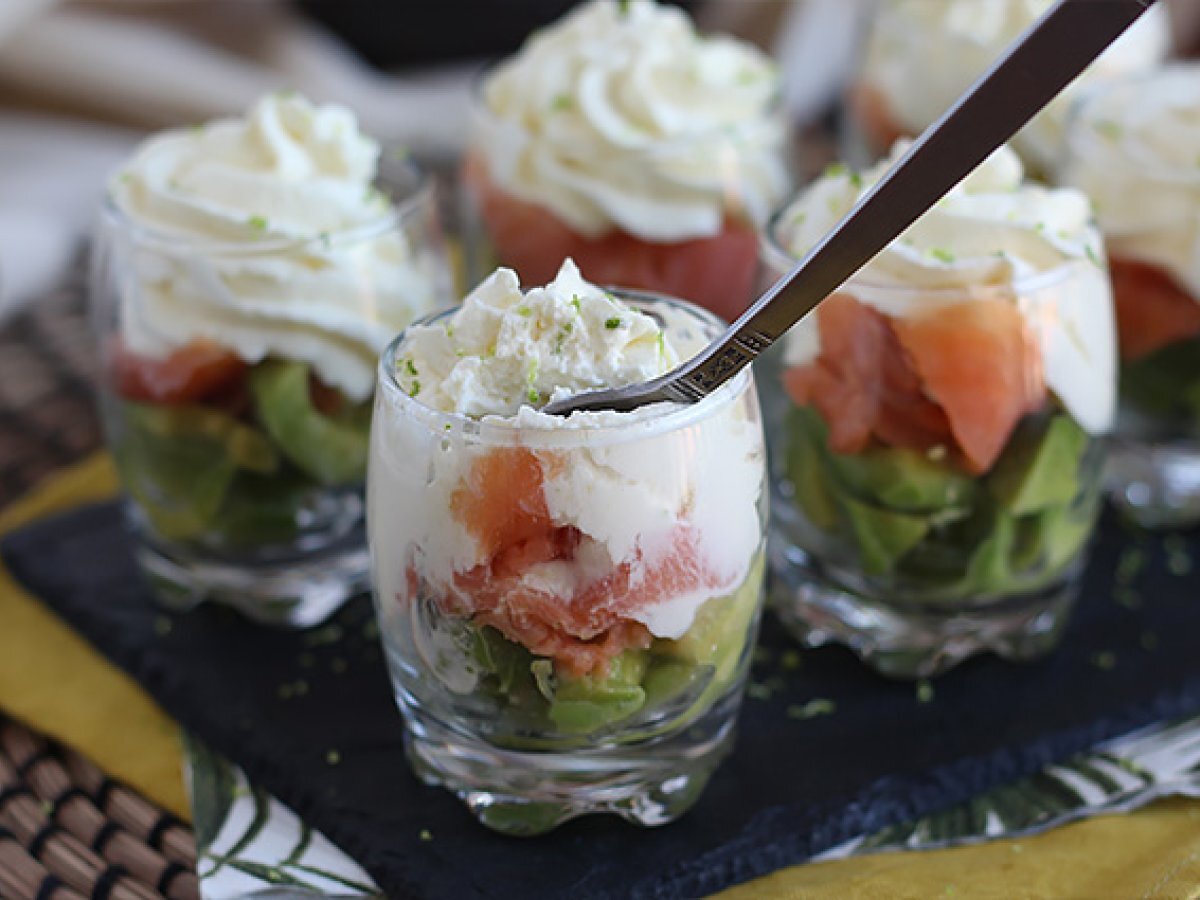 Für einen Last-Minute-Aperitif, entscheiden Sie sich für diese einfachen und nicht zu kochenden Verrines ! Fügen Sie darin geräucherten Lachs und Avocado hinzu und überblicken Sie das Ganze mit einer salzigen Schlagsahne mit Zitrone :-) Ein festlicher und farbenfroher Aperitif! Verfolgen Sie unsere Schritte der Realisierung unten mit unseren Bildern und unserem Video ↓↓
