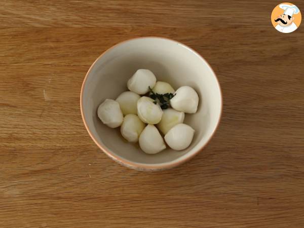 Die Mozzarella-Kugeln in eine Schüssel geben, etwas Olivenöl und gehacktes Basilikum hinzufügen. gut mischen.