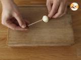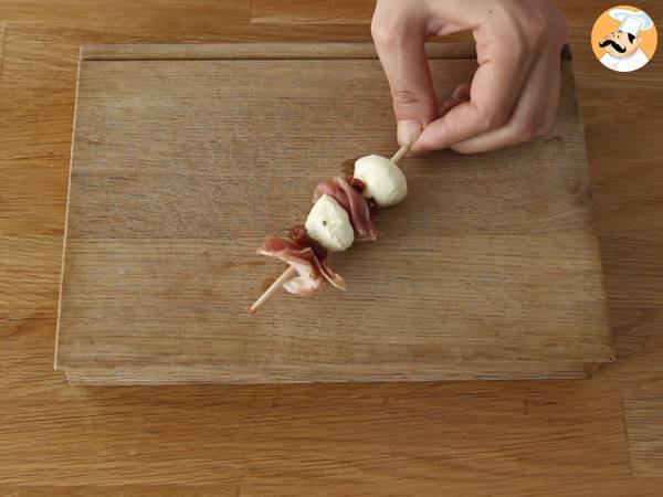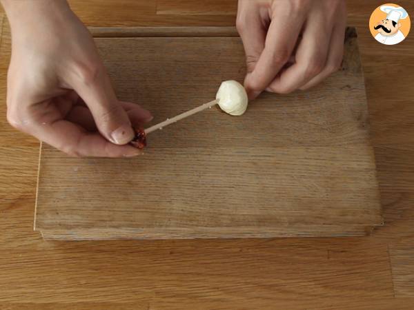 Stecken Sie eine Murmel auf einen Spieß. Fügen Sie ein Stück Rohschinken und ein Stück getrocknete Tomate hinzu.
