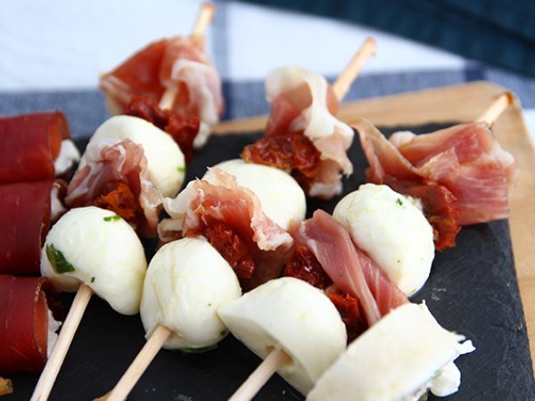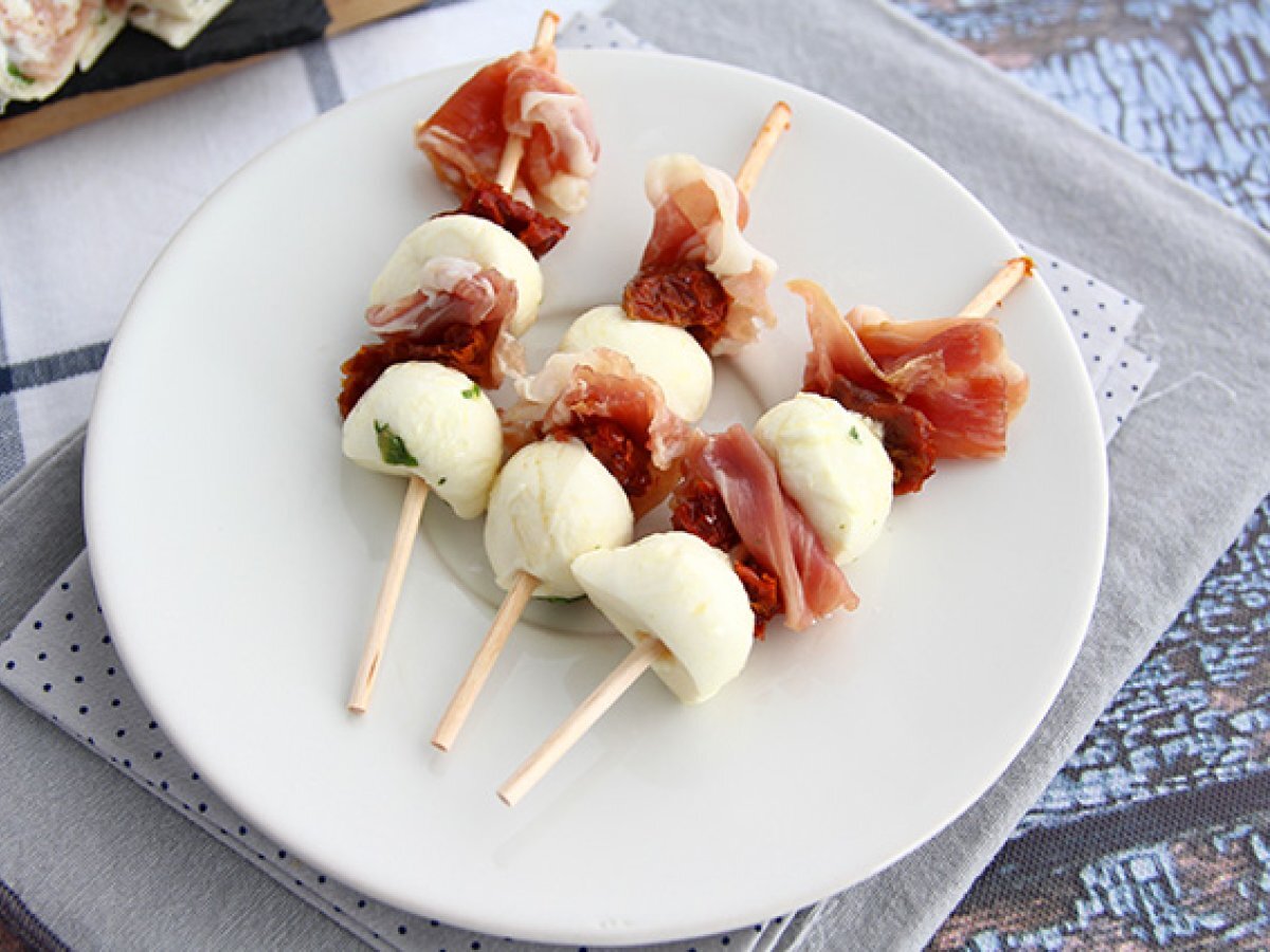 Vorspeisenspieße mit mozzarella, rohschinken und getrockneten tomaten