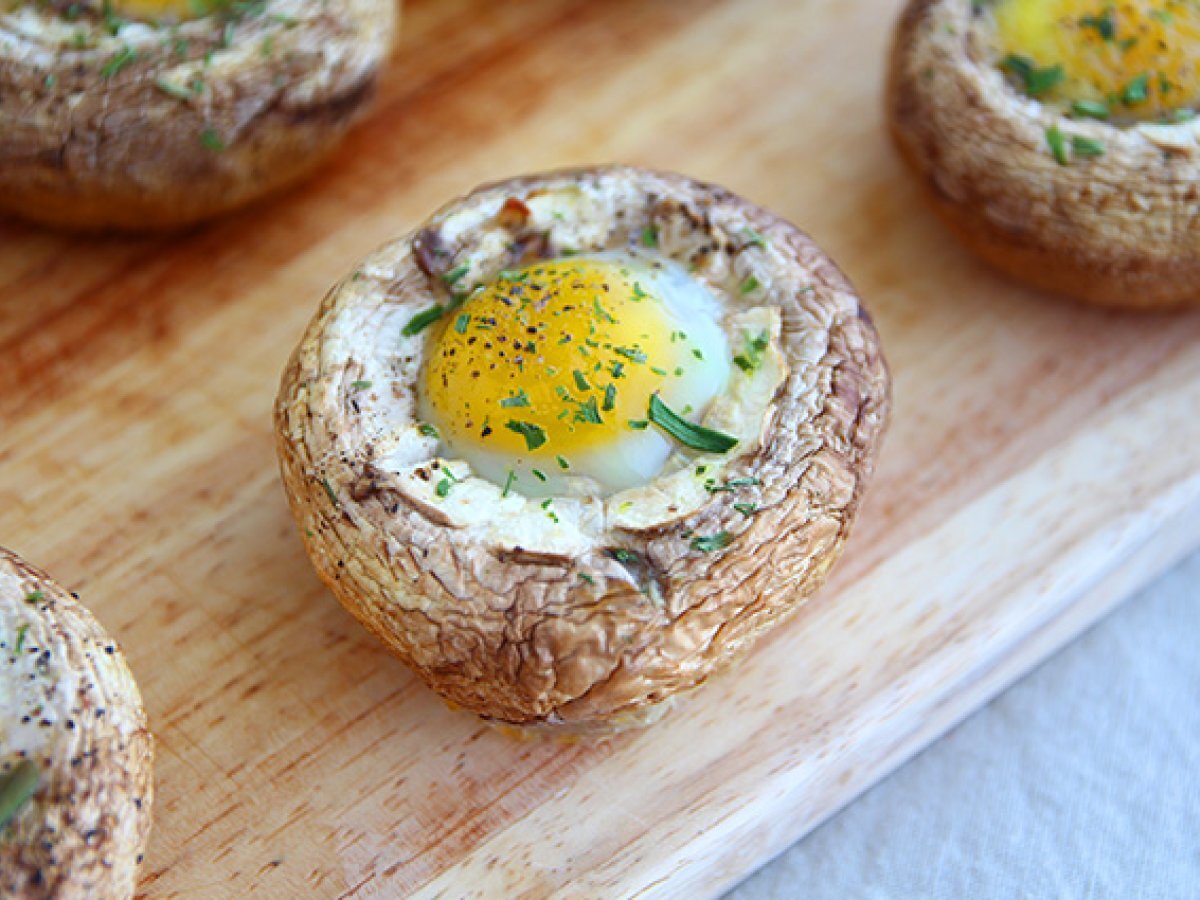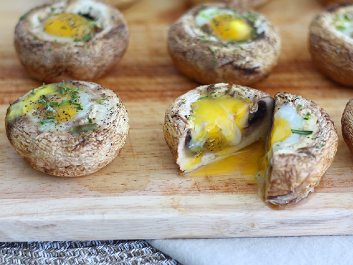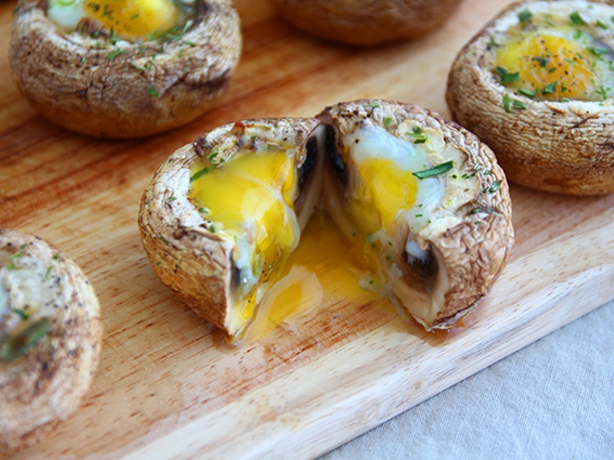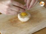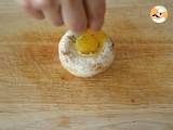 Brechen Sie ein Wachtelei auf und gießen Sie den Inhalt in die Mulde des Pilzes.