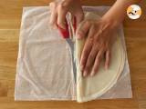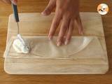 Nehmen Sie ein halbes Blatt, falten Sie die abgerundete Kante zur Schnittkante und geben Sie zum Schluss einen Esslöffel Honig-Ziegenkäse-Mischung.