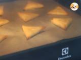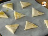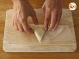 Falten Sie die Samosa, indem Sie das Blatt um den Käse falten, sodass ein Dreieck entsteht. Falten Sie das Dreieck weiter, bis ein kleines Blatt übrig bleibt. Tragen Sie geschlagenes Ei auf, um die Samosa zu verschließen.