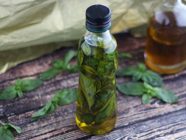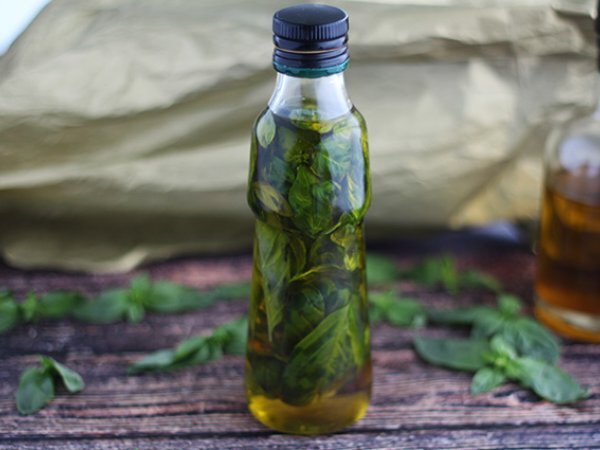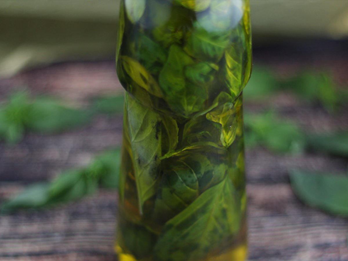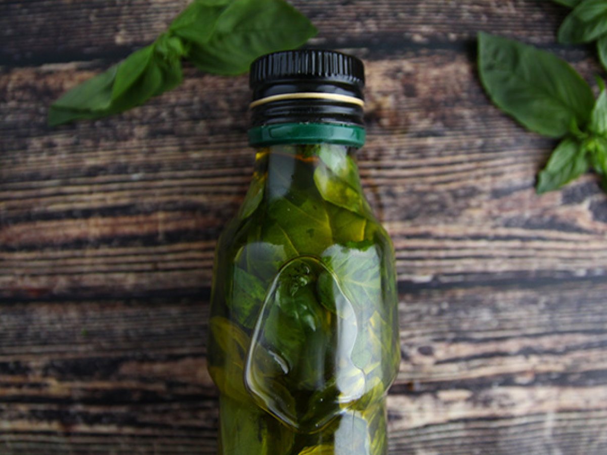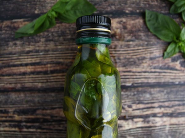 Fügen Sie die Basilikumblätter in eine Flasche. Das Olivenöl gießen und die Flasche verschließen.
