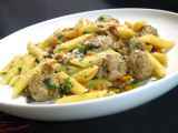 - In einer anderen Pfanne die fein gehackte Zwiebel mit etwas Olivenöl anbraten. Dann Tomatenmark, Sellerie und geschnittene Oliven, Kapern und Kirschtomaten hinzufügen. Bei mittlerer Hitze etwa 3 Minuten köcheln lassen.