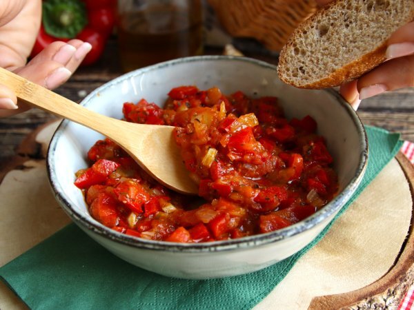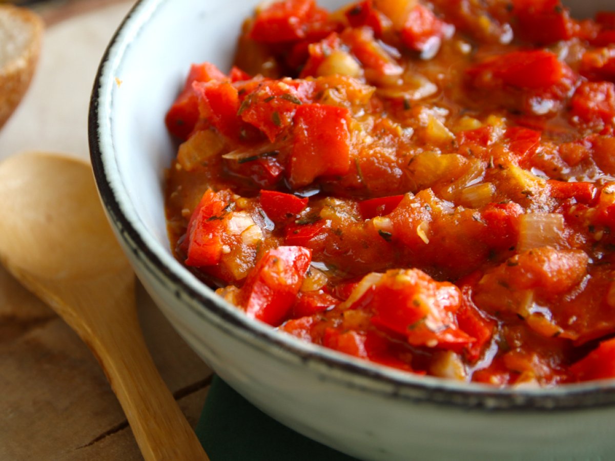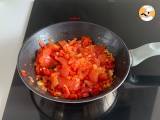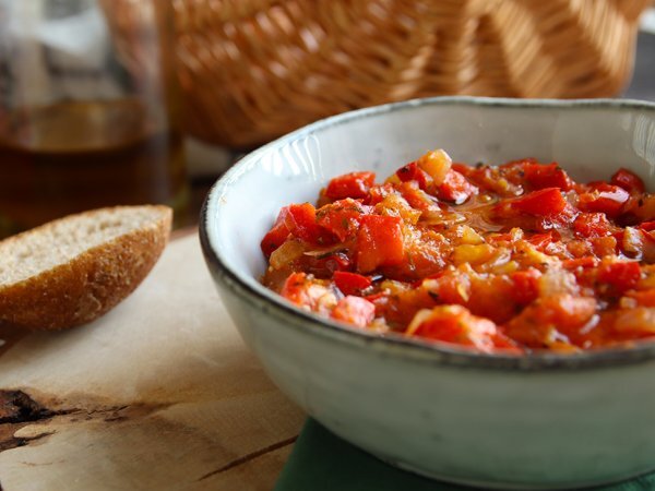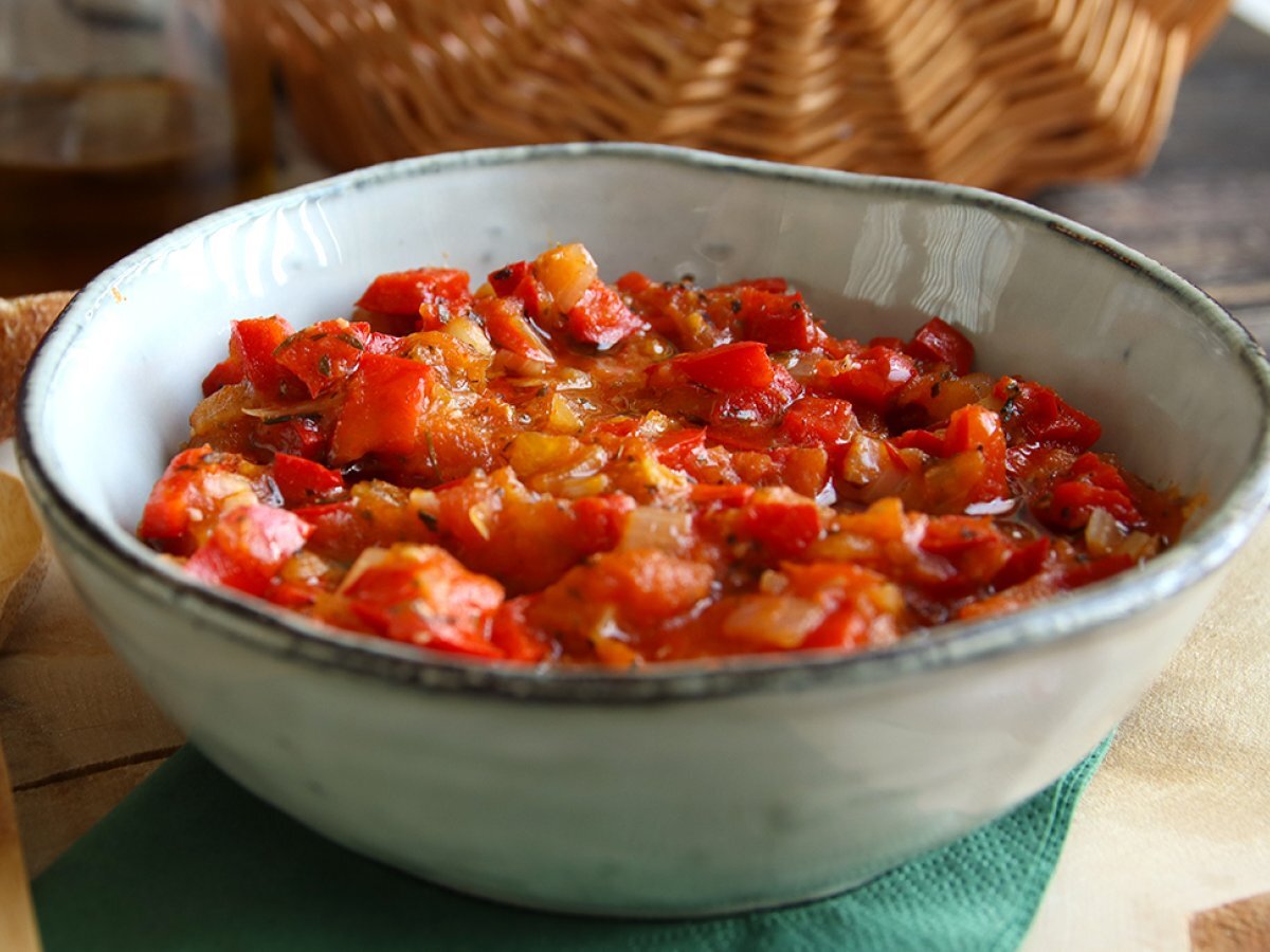 Paprika, Schalotte und Knoblauch in Olivenöl anbraten. Wenn die Schalotte glasig wird, die Tomate hinzufügen. Etwas Wasser hinzufügen. Gut vermischen und bei abgedeckter Pfanne kochen lassen, bis die Konsistenz einer Soße entsteht.