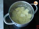 Kartoffeln schälen und grob schneiden. Kochen Sie sie 20 Minuten in kochendem Salzwasser.