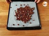 Den Backofen auf 200°C vorheizen. Die Haselnüsse auf ein mit Backpapier ausgelegtes Backblech legen. 10 Minuten rösten.