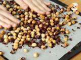 Das Backblech aus dem Ofen nehmen und abkühlen lassen. Wenn die Haselnüsse kalt sind, rollen Sie sie mit den Händen, um die Haut zu entfernen. Schokolade schmelzen.