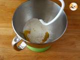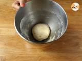 Geben Sie die Mischung aus Wasser und trockener Backhefe in die Schüssel. Auf Geschwindigkeitsstufe 2 kneten, bis der Teig zusammenkommt. Mindestens 1 Stunde bei Zimmertemperatur stehen lassen.