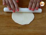 Den Teig entgasen, dann in vier gleich große Teigstücke (ca. 85 g) teilen und diese Teigstücke ausrollen.
