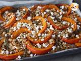 Eine ganz einfache Art, den Kürbis zuzubereiten: im Ofen :-) So erhalten Sie einen sehr schmelzenden Kürbis, ideal zu Fleisch und Fisch oder zum puren Verzehr. Mit ein paar knusprigen Kichererbsen, etwas Rosmarin zum Würzen, Pinienkernen für den Crunch und Feta-Käse für den Fondant. Eine perfekte Kombination ;-) Mit diesem Rezept reicht der Teig für zwei Backbleche. Etwas, das alle Ihre Gäste zufriedenstellt :-)