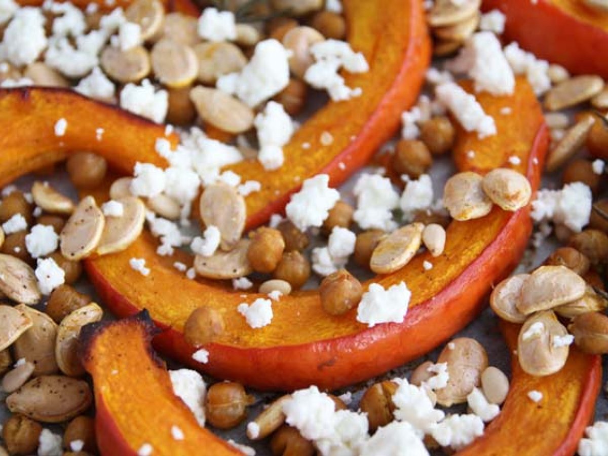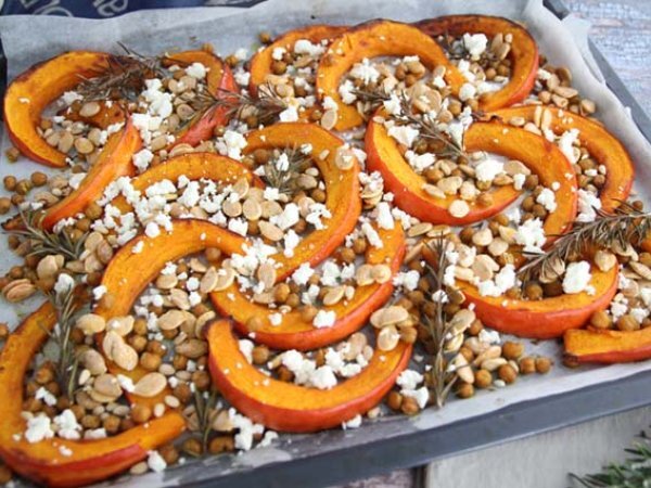 Gebackener kürbis und kichererbsen, rosmarin, feta