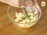 Die Kartoffeln schälen und in Würfel schneiden. Etwa 15 Minuten in kochendem Wasser kochen, abgießen und pürieren.